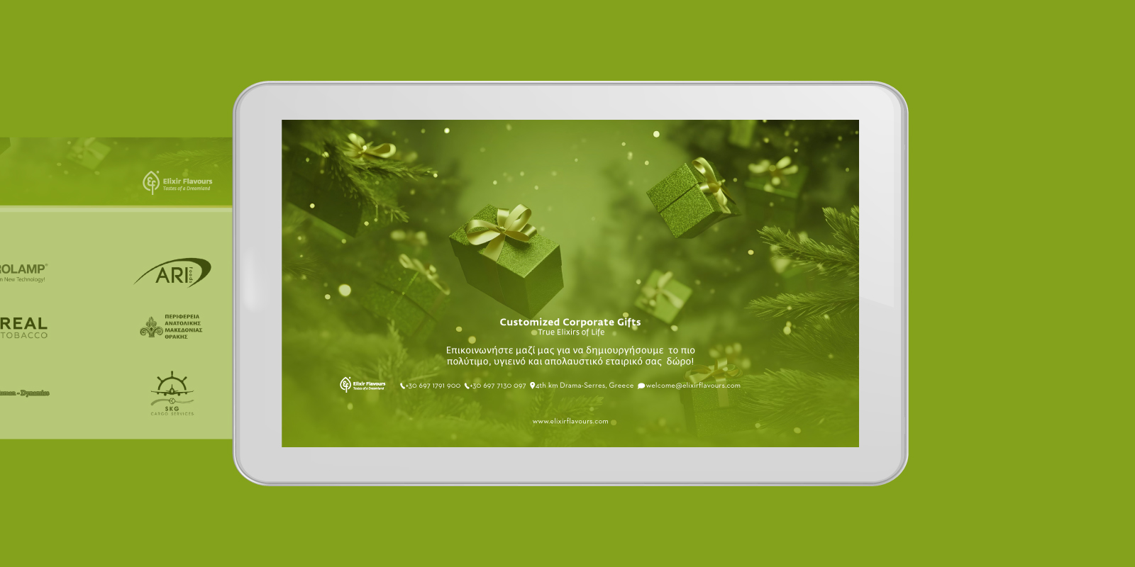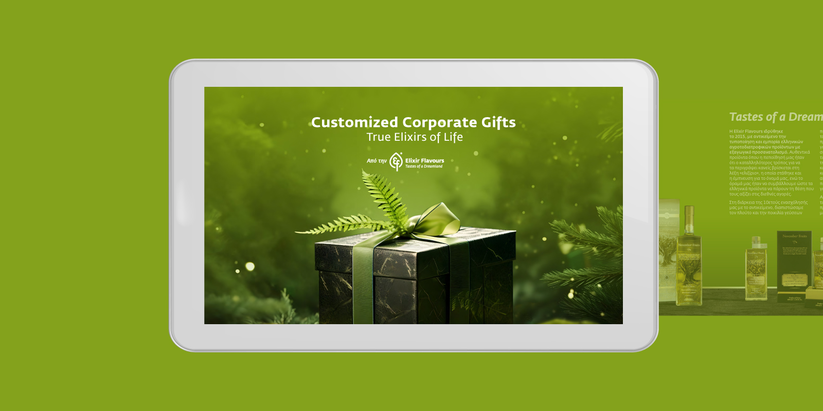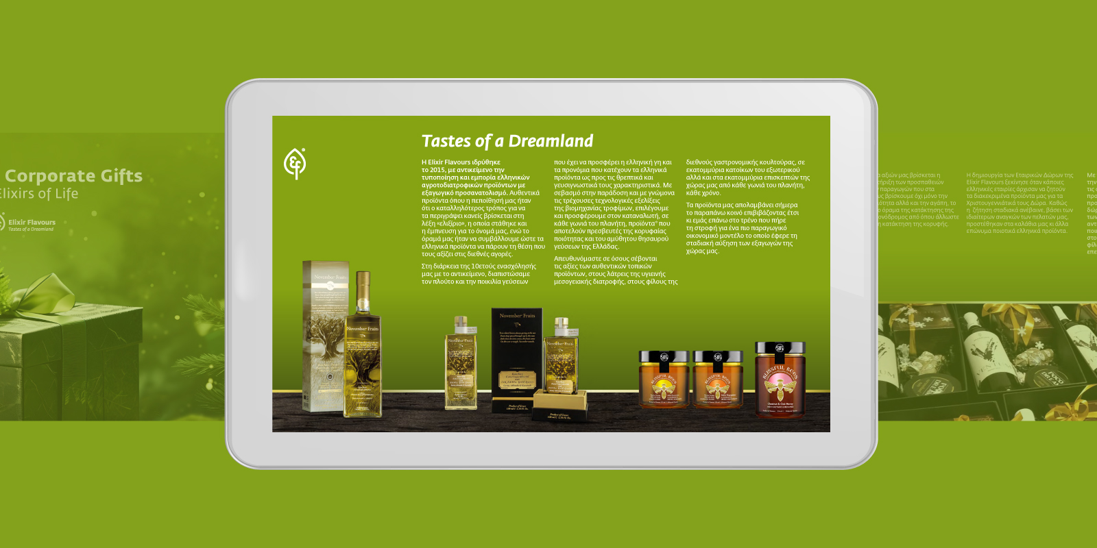 Στόχος του e-brochure ήταν να αφηγηθεί με σαφήνεια και οπτική συνέπεια την ιστορία της νέας υπηρεσίας εταιρικών δώρων της Elixir Flavours. Η BRANDHOUSE σχεδίασε μια αφήγηση που εστιάζει: