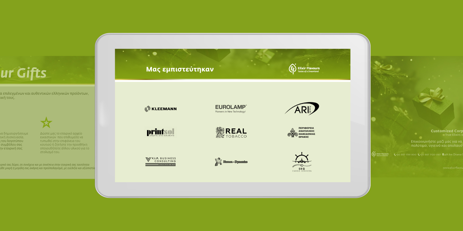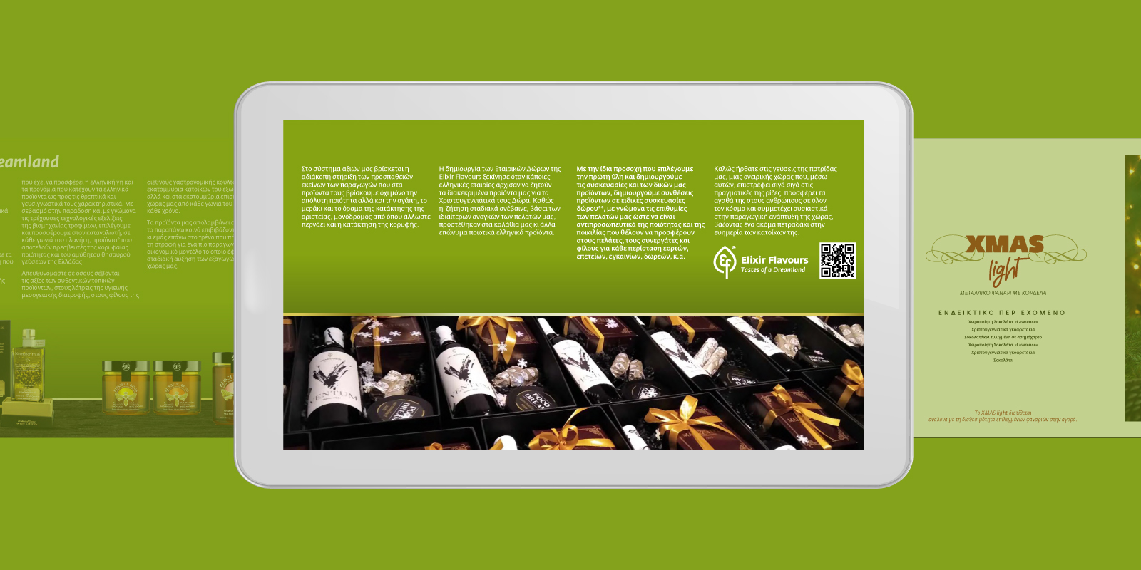 Η BRANDHOUSE ανέλαβε να δημιουργήσει το ολοκληρωμένο εταιρικό e-brochure, που παρουσιάζει με δομημένο τρόπο τα προϊόντα, τις επιλογές δώρων και τις δυνατότητες customization της Elixir Flavours.